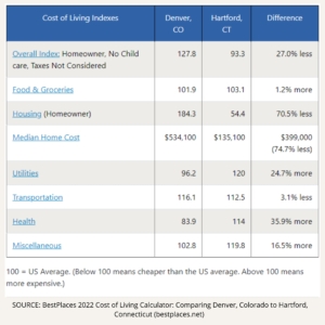 According to BestPlaces.net’s 2022 Cost of Living Calculator: Denver, Colorado vs Hartford, Connecticut